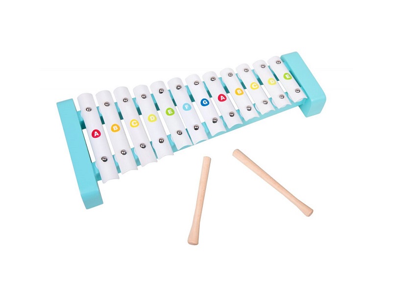 Dziecko wybija dźwięki dzięki dołączonym pałeczkom. Dzwonki w kolorze białym umieszczone zostały na ładnej niebieskiej, drewnianej ramie.