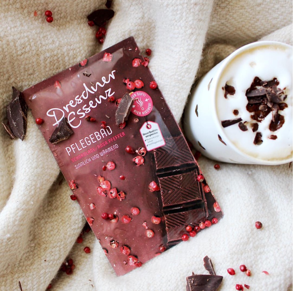 Pielęgnująca sól do kąpieli CZEKOLADA/RÓŻOWY PIEPRZ, aby po prostu się rozpłynąć. Kremowy i ciepły aromat czekolady połączony z delikatną korzenną nutą zapachową różowego pieprzu uwodzi zmysły i pozwala się odprężyć. Jest wprost idealny, aby uwolnić się od codzienności. Kompleks intensywnie pielęgnujących składników z pantenolem, alantoiną i białkiem pszenicy chroni skórę przed wysuszaniem. Nie zawiera składników pochodzenia zwierzęcego.