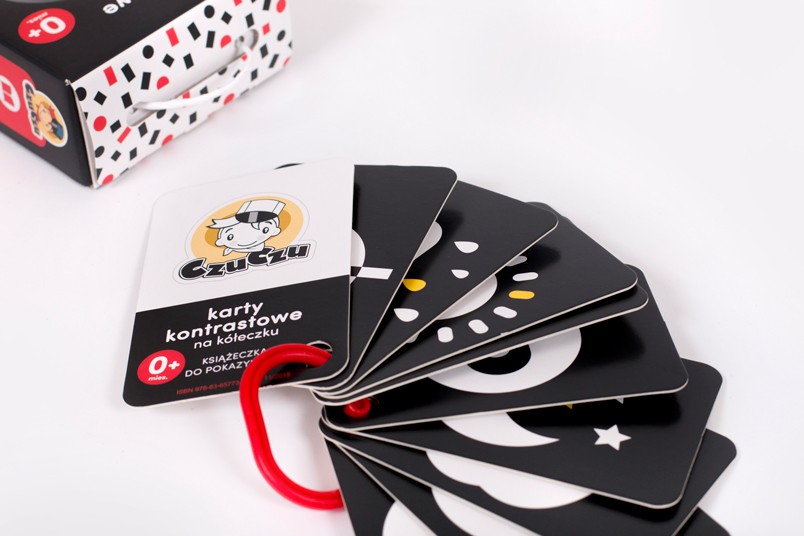 Karty kontrastowe na kółeczku to zestaw stworzony z myślą o rodzicach, którzy chcą aktywnie wspierać swoje maluszki w rozwoju. Oglądanie 20 kontrastowych ilustracji dostosowanych do poziomu percepcji nieco starszych niemowląt, które są już wstanie wyodrębnić z całości niewielkie elementy, pozwala kształtować inteligencję wizualno-przestrzenną, a wspólna zabawa to wspaniały sposób na budowanie więzi i bliskości.