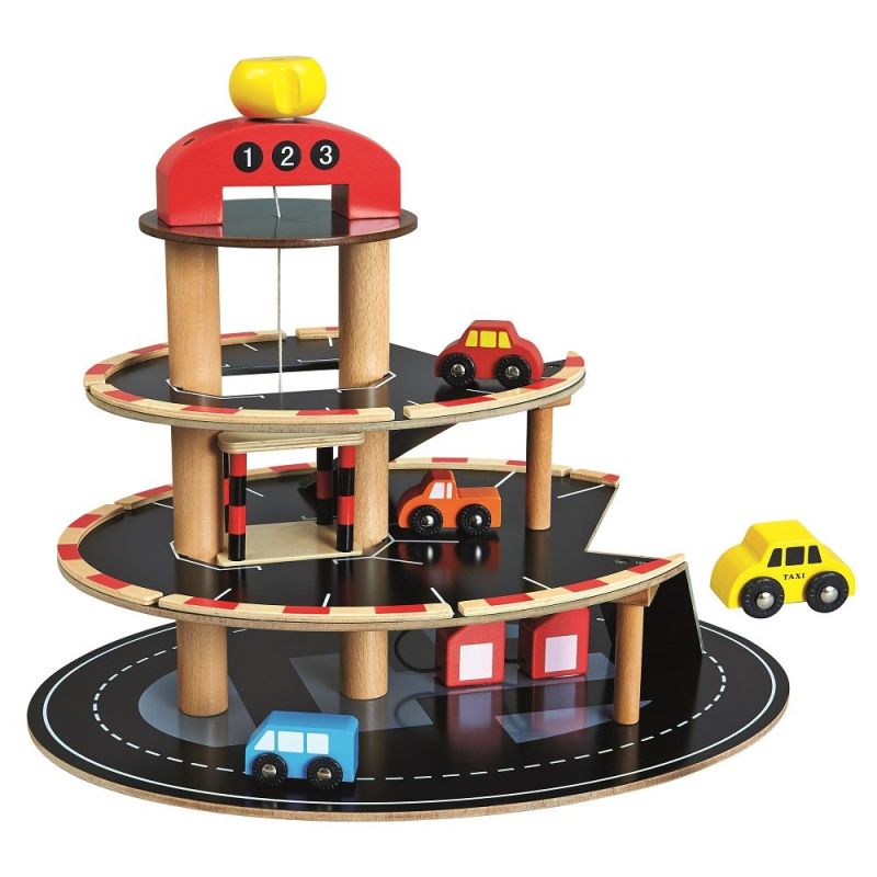 Na szczycie parkingu znajduje się mechanizm windy. Samochodziki wjeżdżają na drewnianą platformę i za pomocą drewnianego pokrętła możemy wciągać je na wyższe poziomy.