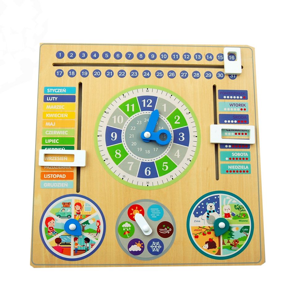 Piękna, funkcjonalna i duża zabawka sprawdzi się w wielu sytuacjach. Taki kalendarz to również świetna pomoc dydaktyczna do przedszkoli i szkół. Dzięki niemu możecie: