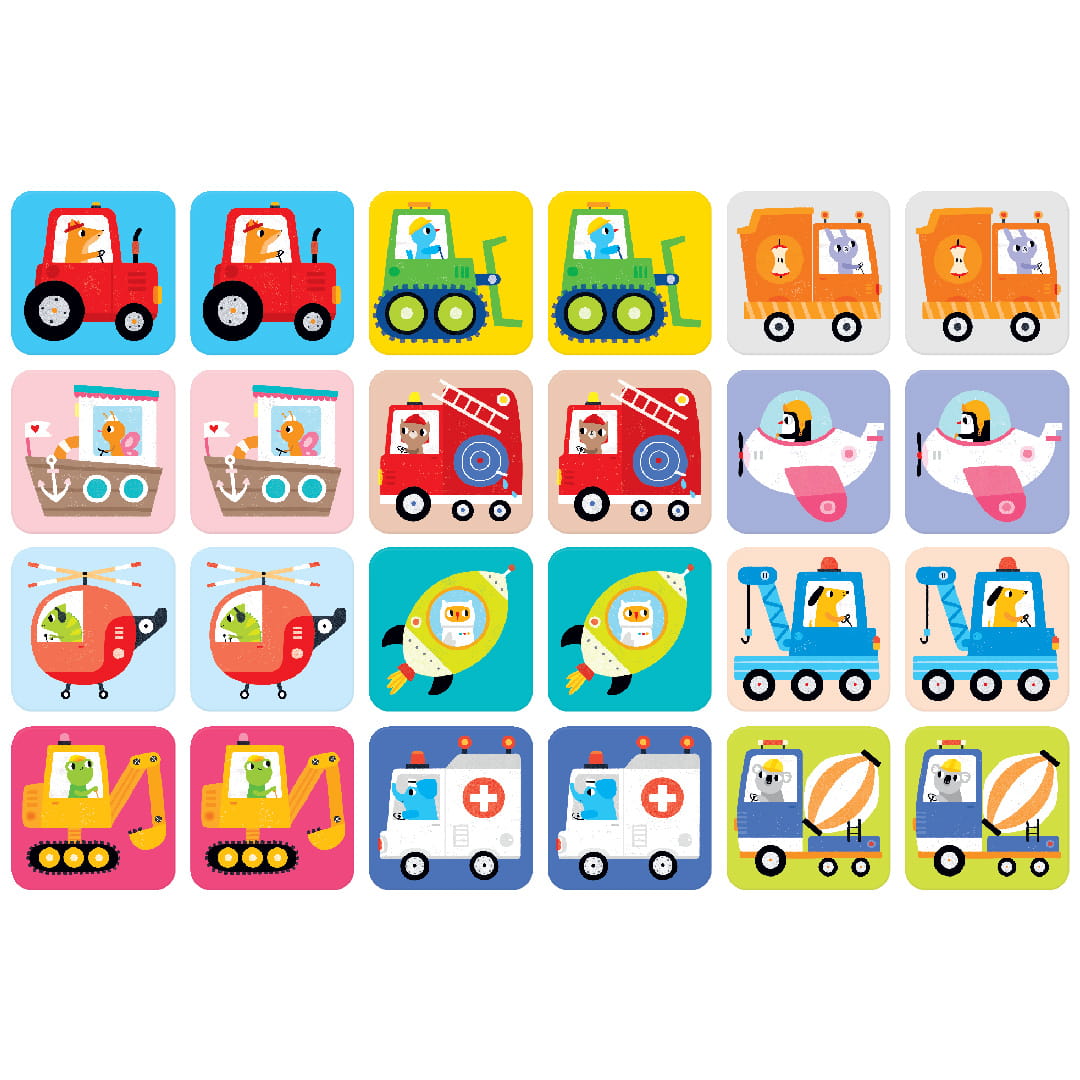 Kolorowe pojazdy ruszają do akcji! Edukacyjny zestaw zawiera 24 duże i trwałe elementy. Znakomicie sprawdzi się jako pierwsza prosta gra pamięciowa.