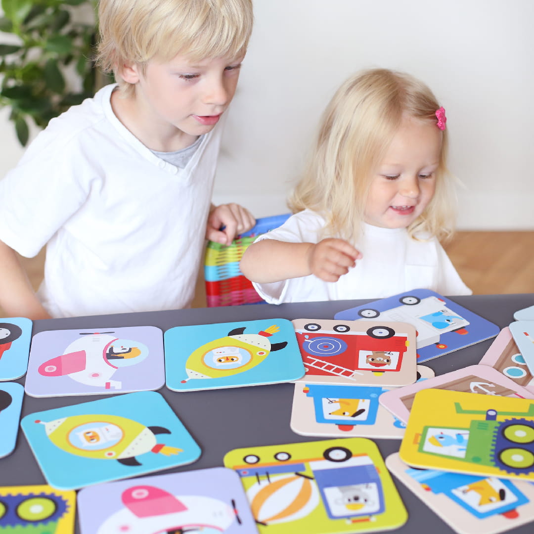 Bawcie się razem na wiele sposobów! Rozłóżcie odkryte elementy i wyszukajcie pary. Możecie to robić na czas. W trudniejszej wersji, odwróćcie je ilustracją do dołu i trenujcie pamięć. Możecie zacząć od mniejszej liczby par i stopniowo zwiększać trudność zabawy. Opowiadajcie o tym, co widać na obrazkach, bawcie się w wydawanie odgłosów pojazdów, nazywajcie kolory. A może wymyślicie własną historyjkę o bohaterach ilustracji? Do zestawu dołączyliśmy poradnik pełen pomysłów na edukacyjną zabawę.
