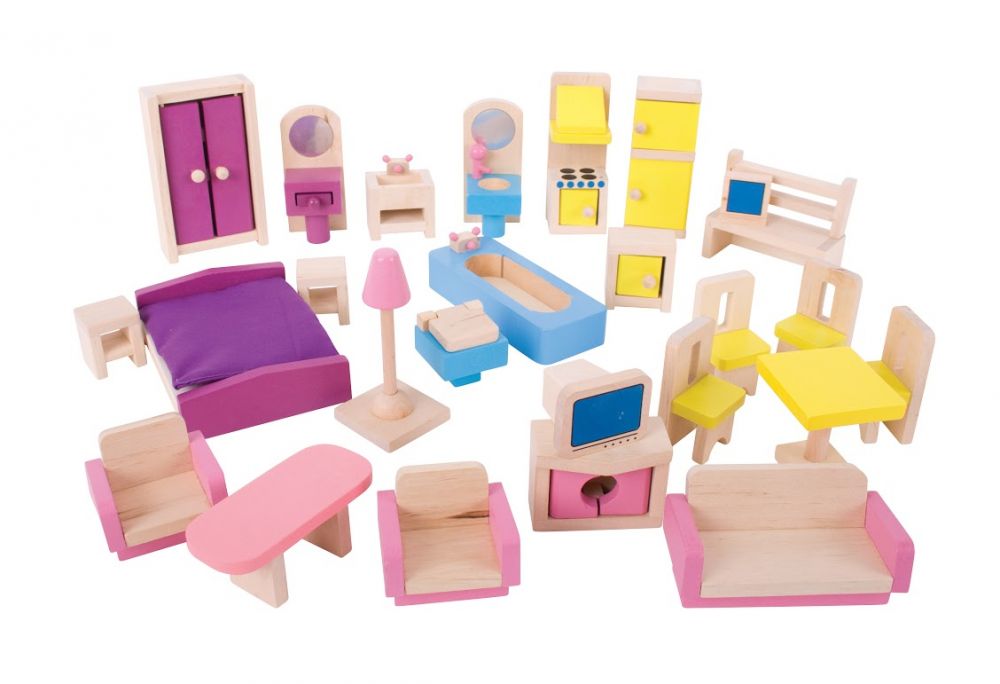 Duży zestaw mebelków drewnianych to idealne dopełnienie do domku. Teraz wystarczy umeblować i można wprowadzać się do takiego domku całą rodzinką.