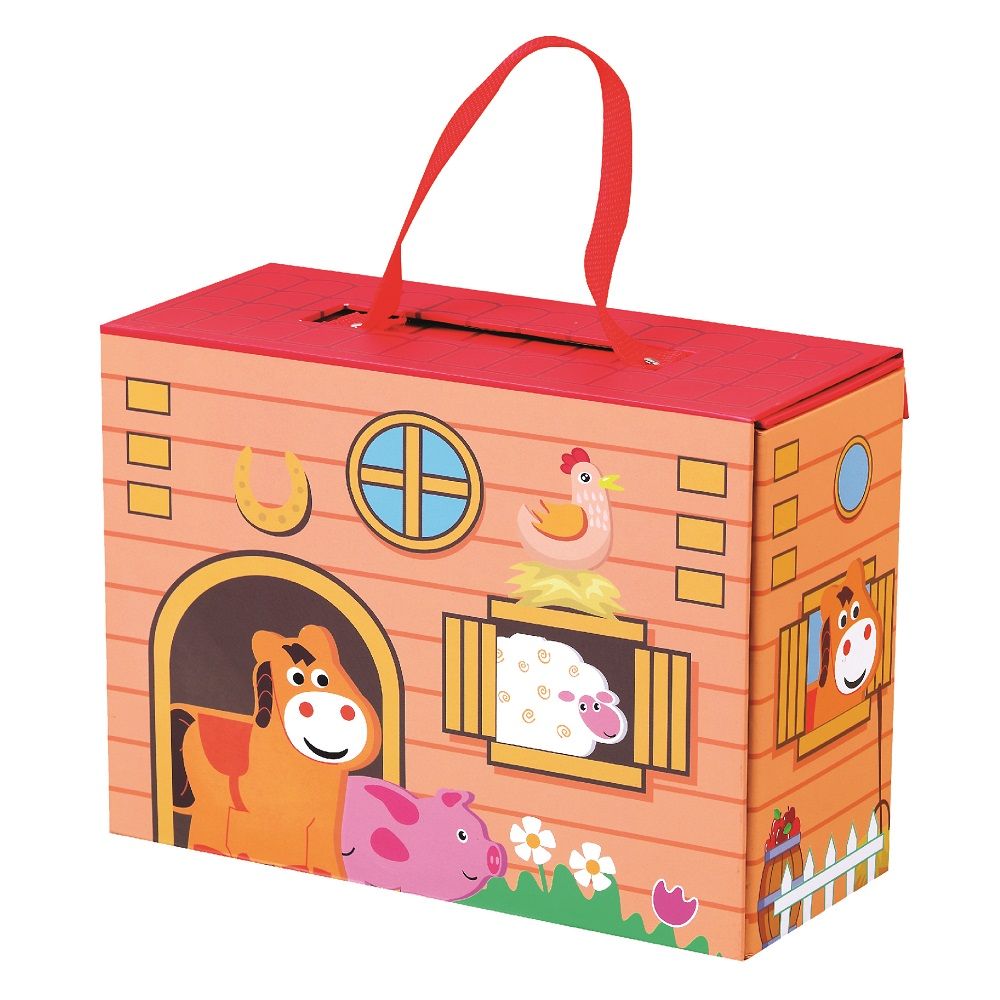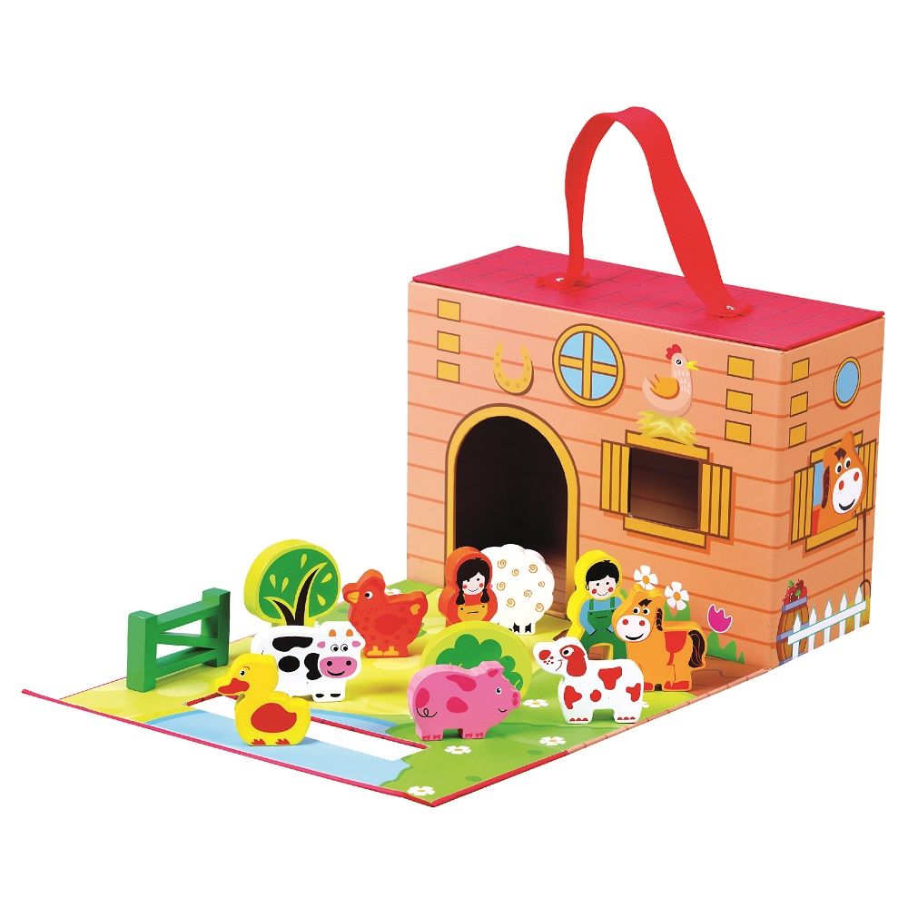 Ta niepozorna walizeczka kryje w sobie wiele dodatkowych skarbów, które wprowadzą Twojego malucha w sielski, wiejski klimat i pozwolą mu poznać kolorowych mieszkańców tego wesołego gospodarstwa. Po rozłożeniu walizeczki oczom brzdąca ukazuje się budynek farmy oraz przyjemne obejście wraz z kwiecistą łąką i niebieskim jeziorkiem. Po zabawie wystarczy zapakować klocki i złożyć walizkę.