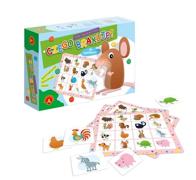 Przesympatyczna zabawa na spostrzegawczość, rozwijająca pamięć. W grze może wziąć udział od 2 do 6 graczy. Każdy z graczy otrzymuje swoją planszę z wizerunkami 16 zwierząt oraz 2 żetony w wybranym przez siebie kolorze. Na stole rozkładamy 6 wybranych tabliczek ze zwierzątkami (identycznymi jak znajdujące się na planszach). Wszyscy gracze przyglądają się wszystkim tabliczkom i próbują zapamiętać jakie zwierzęta są na nich prezentowane. Po krótkiej chwili tabliczki przewraca się rewersem i miesza, odkładając jedną z nich na bok. Pozostałe odwraca się ponownie do góry a każdy z graczy ma za zadanie wskazać brakujące zwierzątko za pomocą żetonów ułożonych na planszy na odpowiednim wizerunku. Jeżeli dziecko jest pewne swojej odpowiedzi kładzie oba żetony na właściwym polu. Jeżeli nie jest przekonane może zdywersyfikować ryzyko kładąc żetony na 2 polach, które jego zdaniem wydają się trafne. Właściwe odpowiedzi są nagradzane czarnymi żetonami. Za wskazanie błędnej odpowiedzi gracz nie ponosi żadnych konsekwencji. Po rozdaniu żetonów powtarzamy rozgrywkę z na nowo wybranymi obrazkami.