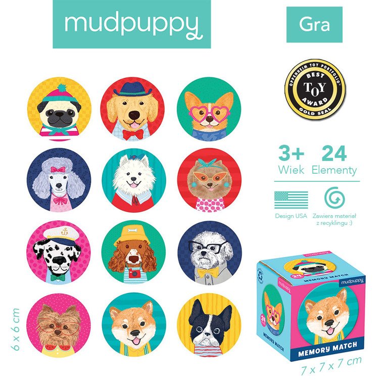 Gra Mini Memory Psy amerykańskiej marki MUDPUPPY składa się 12 par okrągłych kart, które należy skompletować. Parę tworzą dwie identyczne ilustracje. Karty mają przyjemne dla oka kolory i przedstawiają różne rasy psów w zabawnych stylizacjach. Autorką ilustracji jest amerykańska graficzka i miłośniczka zwierząt, szczególnie królików, Liz Mytinger. Karty zostały wykonane z solidnego grubego kartonu, pochodzącego z recyklingu. Gra memory to wspaniała zabawa, zarówno dla dzieci, jak i dorosłych. Ćwiczy pamięć, uczy cierpliwości i skupienia. Zapakowana jest w estetyczne pudełko. Idealnie nadaje się na prezent.
