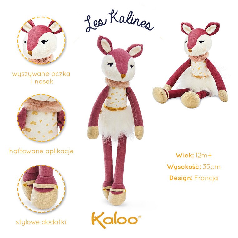 Kolekcję Kalines marki KALOO tworzy 6 nietuzinkowych postaci – sarenka, lisica, lwica, żyrafa, panda oraz sowa. Każda z nich wyróżnia się nie tylko wyjątkowym stylem i detalami, które czynią ją wyjątkową, ale również charakterem i osobowością, dzięki czemu z powodzeniem może stać się ulubioną bohaterką małej dziewczynki. Kolekcja Kalines to także innowacyjne materiały, zachwycające kreacje, ciepłe odcienie beżu, różu i złota oraz piękne opakowania!