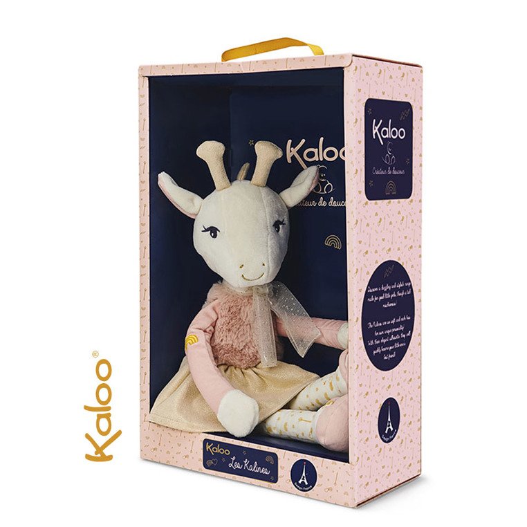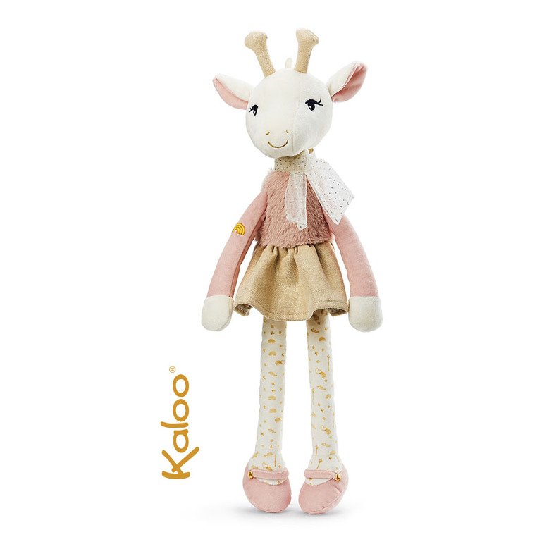 Żyrafa Zarafa francuskiej marki KALOO to idealna przyjaciółka Twojej małej dziewczynki. Jest radosna, słodka i wyjątkowo przyjacielska. Wykonana z niezwykle miękkiego aksamitnego pluszu w odcieniach bieli, różu i beżu. Ubrana jest w różową puchową bluzeczkę, beżową zamszową spódniczkę, różowe zamszowe baletki, a na szyi ma przewiązaną tiulową apaszkę. Żyrafka ma urocze czarne oczka z zalotnymi rzęsami, złoty pyszczek i różki – wszystkie te elementy są miękkie, dzięki czemu zabawka jest w pełni bezpieczna dla dziecka.