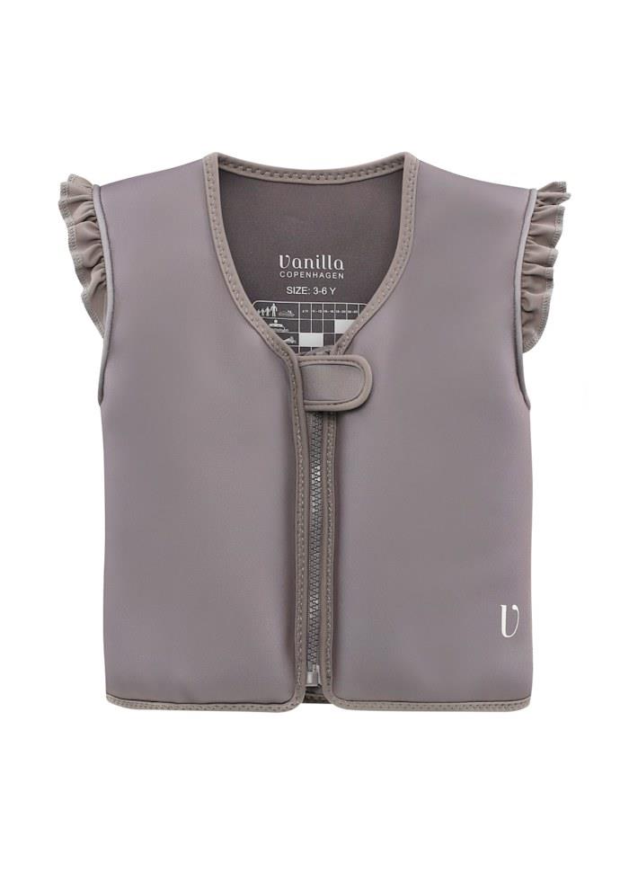Neoprenowa kamizelka wypornościowa do pływania marki Vanilla Copenhagen dla dzieci w pięknym kolorze ciemno beżowym z delikatną falbanką na ramionach i cudownymi łabędziami królewskim na plecach, sprawdzi się idealnie podczas nauki pływania i zabawy, aby maluchy w kamizelce mogły pływać jak rybki w wodzie. Kamizelka zwiększa komfort i bezpieczeństwo dziecka w basenach, w parkach wodnych, nam morzem i są to podstawowe cele i elementy kolekcji kąpielowej Vanilla Copenhagen. Kamizelka posiada osiem wewnętrznych pływaków. Zapewniają one pływalność dostosowaną do rozmiaru, potrzeb i umiejętności pływackich dziecka. Wyporność można regulować, wyjmując pływaki z kieszeni wewnątrz kamizelki. Gdy dziecko znajdzie się na odpowiednim poziomie, będzie mogło z łatwością kontrolować swoją pływalność.