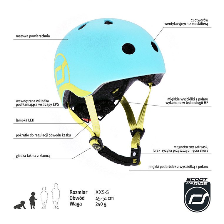 Ultralekki (waży zaledwie 240 g!), innowacyjny i stylowy dziecięcy kask ochronny austriackiej marki SCOOT&RIDE, który „rośnie” razem z maluchem. Dla dzieci już od 1. roku życia, na obwód głowy od 45 do 51 cm, regulowany za pomocą pokrętła z tyłu.