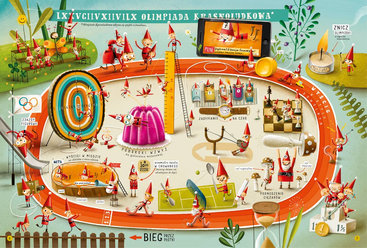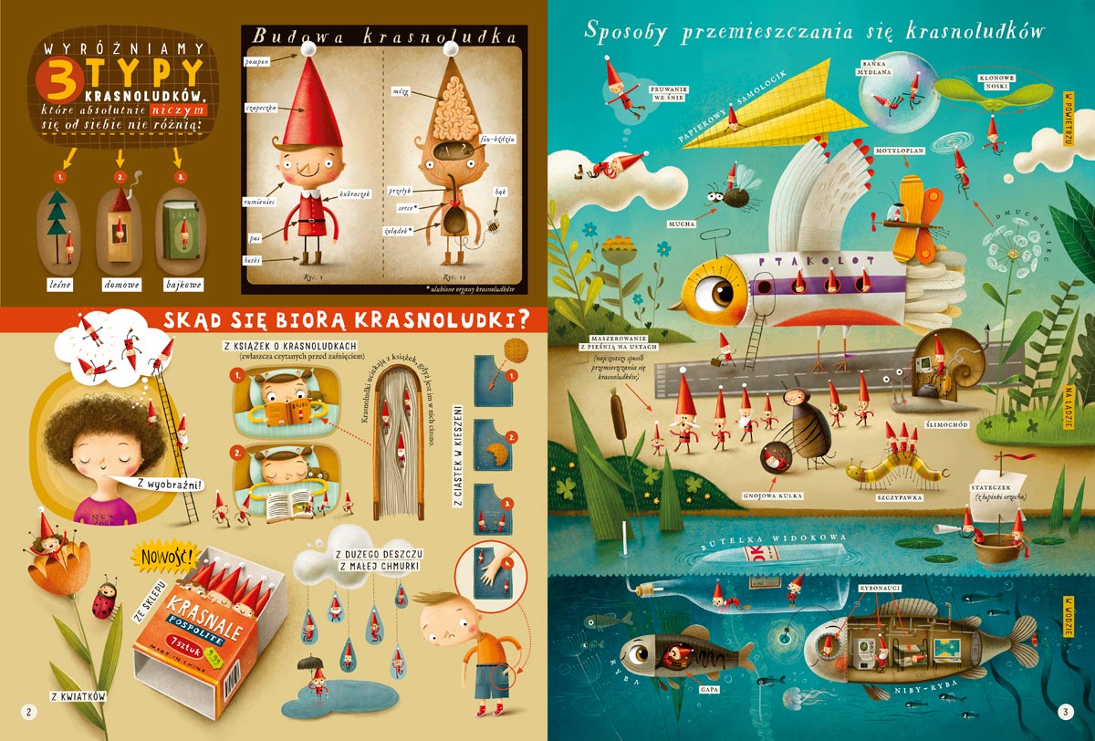 W książeczce pojawią się krasnoludki domowe, bajkowe, leśne, doniczkowe czy poranne, a każdy typ będzie nieco inny. Bogate ilustracje przedstawiają z kolei ślimochód, a także prawdziwe wyścigi w miodzie, w których bieżnię stanowi chlebek z twarożkiem. Czytelnicy natkną się również na człowieka, który został zakażony krasnoludozą. Ta zabawna, bajkowa, a czasem lekko absurdalna lektura nie jest skierowana wyłącznie do najmłodszych. Także dorośli będą się przy niej świetnie bawić, odrywając się od szarej codzienności i pozwalając sobie na moment odprężenia. Najlepiej jednak sięgać po „Krasnoludki. Fakty. Mity. Głupoty” w większym, rodzinnym gronie i wspólnie omawiać poszczególne informacje zawarte w książeczce.