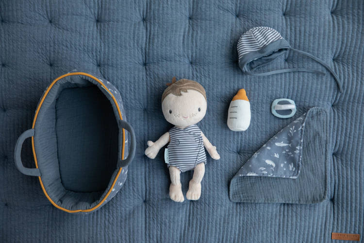 Laleczka Baby Jim od Little Dutch to malutki chłopiec, który będzie wspaniałym przyjacielem twojego dziecka. Cały zestaw składa się z nosidełka z uroczym motywem Ocean Blue, laleczki, którą można rozbierać, czapeczki, kocyka dwustronnego, smoczka, który przyczepia się na magnes oraz butelki z mlekiem. Dziecko od najmłodszych lat uczy się opieki nad maluszkiem. Może zobaczyć jak należy malucha prawidłowo ubierać / rozbierać oraz karmić buteleczką i się nim opiekować. Do kompletu idealnie pasują pozostałe Laleczki Jim w rozmiarach 10, 35 i 50cm. Doskonały pomysł na prezent.