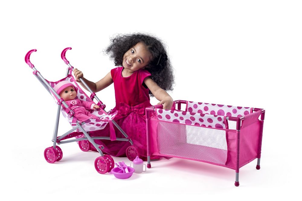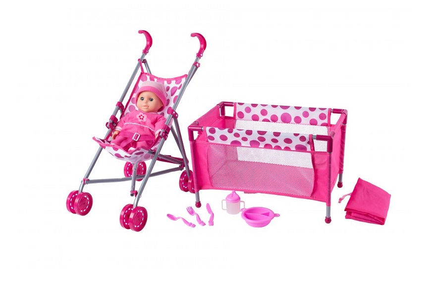 Wózek to klasyczna spacerówka, którą łatwo się składa i rozkłada. Zabezpieczenie wózka przez złożeniem to trzy elementy: dwa elementy na rurki po obu stronach wózka oraz krzyżak z tyłu. Kolorowe kropeczki na siedzeniu dodają całości uroku. Wózek utrzymany w różowo-szaro-białej kolorystyce. Z przodu wózek posiada pas chroniący przez wypadnięciem, jak w prawdziwym wózku.