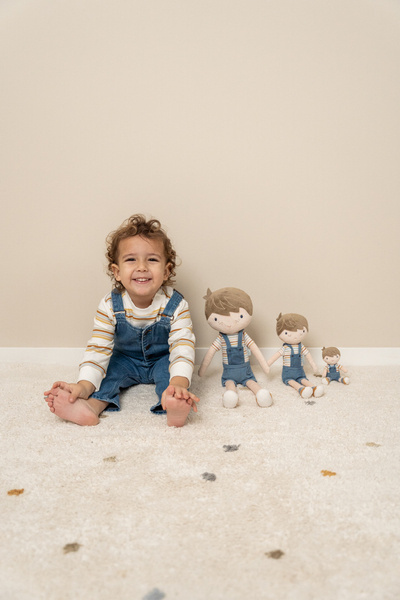 Urocza i przytulna lalka Jim wykonana z miłego i miękkiego materiału. Będzie wspaniałą towarzyszką dziecięcych zabaw i ukochaną przytulanką. Wyglądem przypomina prawdziwego chłopca. Laleczka posiada koszulkę w paski, krótkie spodenki z szelkami w kolorze musztardowym z guziczkami oraz niebieskie buciki. Można ją posadzić. Mała laleczka zmieści się do kieszeni spodni, także zawsze można ją mieć przy sobie na spacerach. Zapakowana w piękne, kartonowe pudełeczko ze sznurkiem będzie wspaniałym prezentem dla każdego chłopca. Do kompletu można dokupić lalkę Jima w rozmiarze 35 i 50cm.