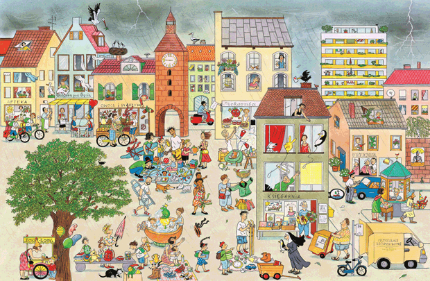 Każda kolejna strona przepełniona jest szczegółami i barwnymi ilustracjami. Poznajemy fragment miasta, a szczególnie ulicę Czereśniową, na której obecnie tętni życie! Nadeszło lato i dzieci przestały chodzić do szkoły. Mogą biegać boso po trawie, bawić się, a sprzedawcy lodów cieszą się z ogromnego utargu. Nic jednak nie dzieje się przypadkowo, dlatego każda ilustracja zawiera tych samych bohaterów, których losy możemy śledzić w różnych momentach dnia. Poszukiwanie ulubionych postaci zajmuje trochę czasu, a każda historia przebiega w zupełnie inny sposób. Ktoś odnajdzie zagubione pingwiny, a ktoś inny spanikuje, kiedy nadejdzie niezapowiedziana burza! Poszukiwanie kolejnych osób sprawia niemałą frajdę i zapewnia zajęcie na wiele godzin.