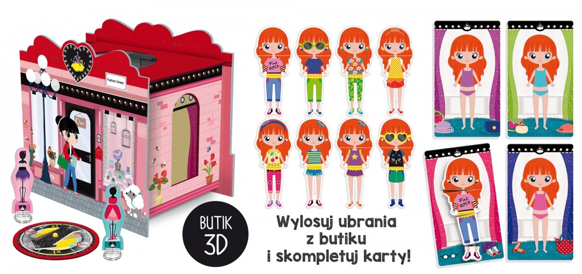Zestaw edukacyjny zawierający butik z ubraniami, dzięki któremu dziecko ma okazję poznać elementy codziennego ubioru i użyć ich, dopasowując je do odpowiednich postaci. Zabawa i edukacja to nowa seria edukacyjna, która pozwala dzieciom na poznawanie określonych obszarów i zdobywanie istotnych kompetencji, które są istotne w późniejszych etapach życia. Światowa Organizacja Zdrowia wyodrębniła 10 umiejętności życiowych, które są potrzebne by wyrosnąć na lepszą i szczęśliwszą osobę, która jest w stanie prowadzić godne życie. I to właśnie te umiejętności są rozwijane w grach z tej serii, które są również dla dziecka świetną zabawą.