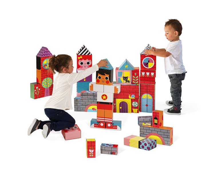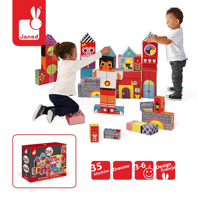 estaw kolorowych, kartonowych klocków 2w1 francuskiej marki JANOD to aż 35 dwustronnie ilustrowanych dość sporych brył, z których można tworzyć postacie lub budynki, komponowane dowolnie wedle tego, co podpowie dziecku wyobraźnia. 30 klocków ma kształt prostopadłościanów o 3 różnych rozmiarach, a pozostałe 5 – trójkątnych daszków czy czapeczek. Kartonowe bryły są lekkie i poręczne, a ich układanie nie tylko rozbudza wyobraźnię przestrzenną, ale też przy okazji zapoznaje dziecko z podstawami geometrii i wspiera naukę precyzji.
