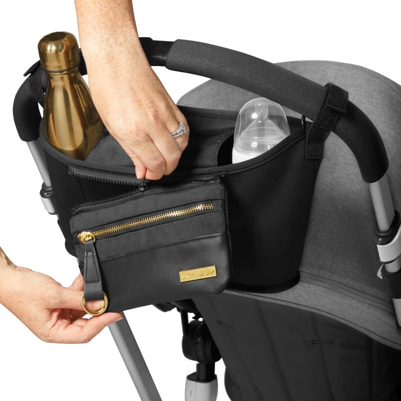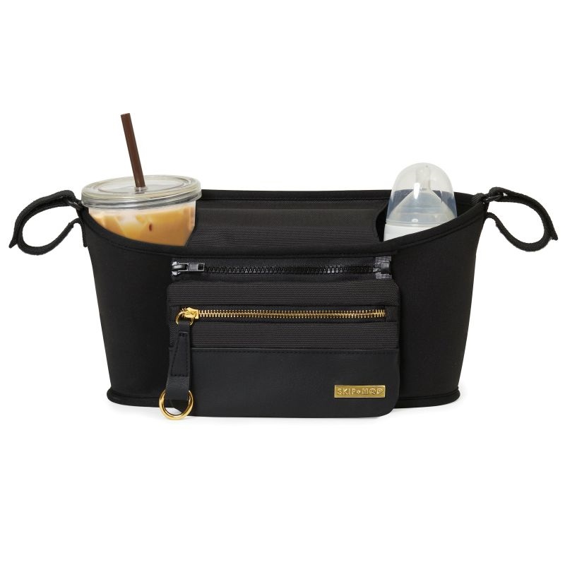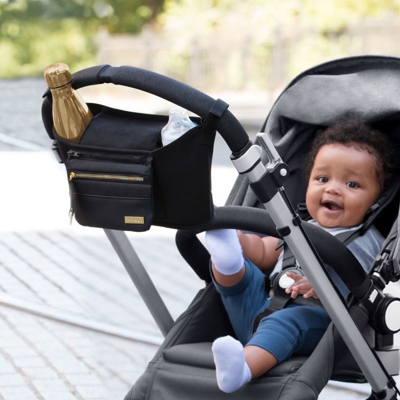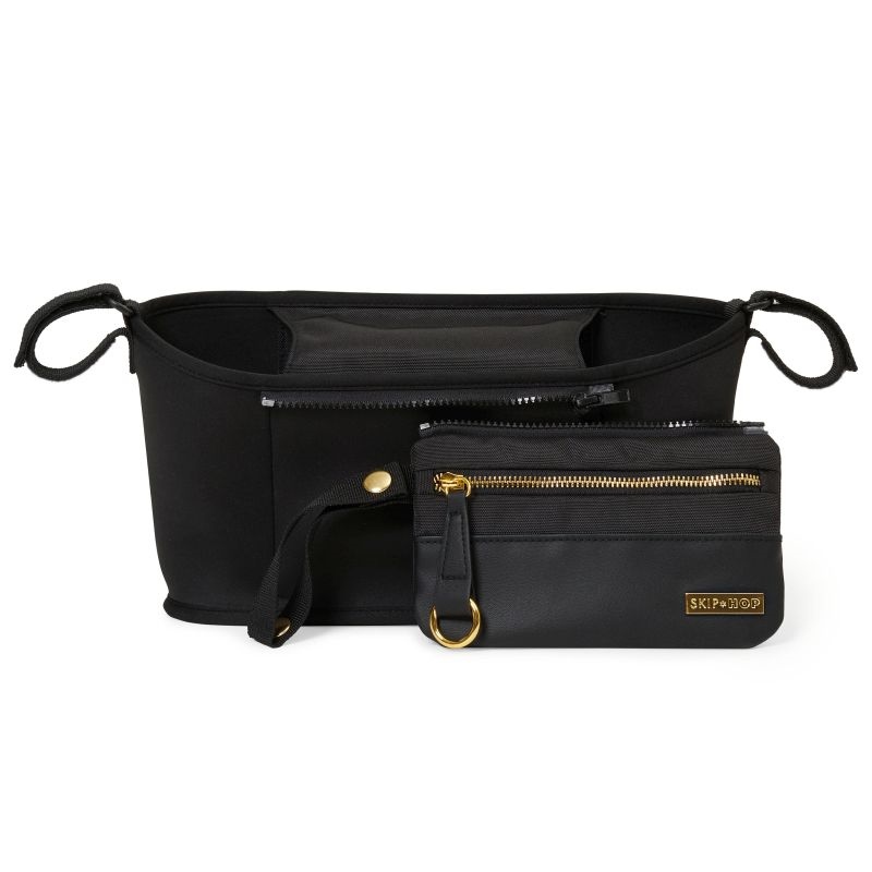 Odświeżyliśmy nasz niezastąpiony organizer do wózka i sprawiliśmy, że stał się jeszcze bardziej funkcjonalny. Dodaliśmy wygodne zamknięcie do głównej kieszeni, eleganckie, metalowe akcenty w złotym kolorze oraz wykończenia ze skóry ekologicznej. Dzięki temu zwykły organizer stał się stylowym gadżetem dla modnej mamy. Elastyczne kieszenie organizera pomieszczą butelki, kubki z kawą oraz wszystkie niezbędne drobiazgi. Organizer posiada specjalną kieszonkę z uchwytem na nadgarstek, którą w razie potrzeby można odpiąć od organizera i korzystać z niej jak z podręcznej torebki. Uniwersalny system mocowania (paski z rzepami), sprawia, że organizer będzie pasował do każdego wózka.