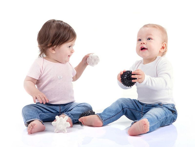 Zestaw zawiera 4 piłeczki: białą z podłużnymi wypustkami, czarną z małymi wypustkami, czarną z większymi wypustkami oraz białą z wklęsłymi kółeczkami.
