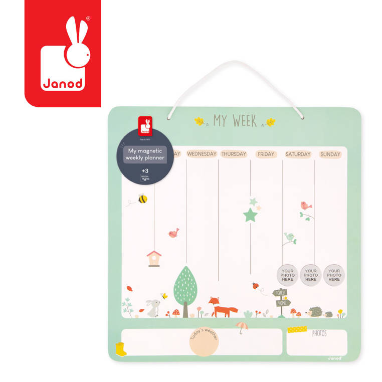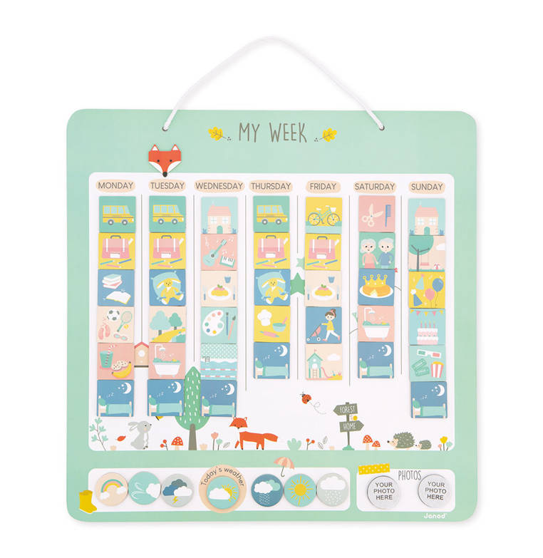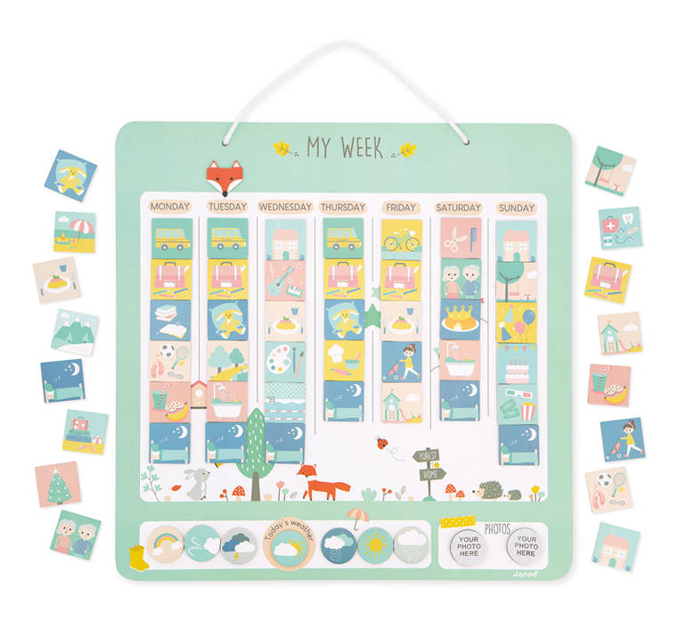 Magnetyczna układanka Planner tygodniowy francuskiej marki JANOD to doskonała i praktyczna zabawka, rozwijająca nie tylko poczucie czasu, świadomość obowiązków i umiejętność organizacji, ale także kreatywność i wyobraźnię. Zabawa polega na układaniu magnesów na dużej planszy, na której znajduje się 7 kolumn z nazwami kolejnych dni tygodnia. W zestawie jest aż 91 magnesów, przedstawiających różne zadania do wykonania lub plany na dany dzień, np. podróż do szkoły, czytanie, wizyta u fryzjera, wyjście na plac zabaw, kino, przyjęcie urodzinowe itd., 7 magnesów z pogodą, 2 puste magnesy do stworzenia własnych symboli aktywności, 3 magnesy, na których można przykleić wybrane przez siebie zdjęcia, a także magnes-znacznik w kształcie lisiej mordki do umieszczania przy aktualnym dniu tygodnia. Układanka ta będzie służyć dziecku przed bardzo długi czas i nieprędko się znudzi, bo daje wiele możliwości zmian i kreacji. Jest pięknie wykonana, co dodatkowo rozbudza zmysł artystyczny, a ponadto ćwiczy sprawność manualną u dziecka.
