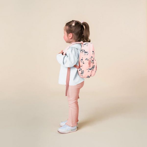 Plecak z kolekcji To The Zoo holenderskiej marki Kidzroom to uroczy plecak dla Twojego małego szkraba. Odkrywanie świata, wychodzenie na zewnątrz i bycie zdumionym, to jest to, w czym dzieci są dobre! Prawdziwi odkrywcy są zawsze gotowi do drogi. Dzięki uroczym zebrom w paski w postaci zwierzęcego nadruku na różowym tle jest to idealna torba dla każdego dziecka i co ważne wykonana z miękkich materiałów jakie pochodzą z poliestru z recyklingu (rPET). Plecak ma poręczną przednią kieszeń z zamkiem błyskawicznym na mniejsze przedmioty. Duża komora główna ma poręczny podwójny zamek błyskawiczny i oferuje miejsce na pudełko na lunch lub dodatkowy zestaw ubrań. Poręczny, gdy dziecko zabiera plecak do przedszkola czy szkoły. Ciemnoróżowe wykończenia z eko skórki przy zamkach są solidne, a uchwyt na górze pozwala zabrać plecak ze sobą lub go powiesić. Plecak posiada również regulowane i wyściełane paski na ramiona oraz wzmocniony tylny panel z wygodnej pianki dla dodatkowego komfortu noszenia, wewnątrz znajduje się metka z imieniem, aby każdy wiedział, do kogo należy. Plecak, z którego można być dumnym!