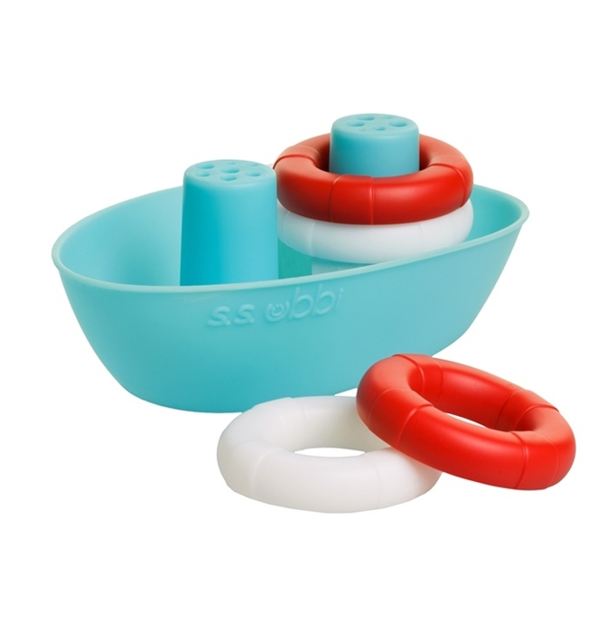 Łódka Ubbi to miękka silikonowa zabawka do kąpieli z 4 plastikowymi kołami ratunkowymi, która w trakcie zabawy unosi się na wodzie. Dzięki znajdującym się na szczycie masztów otworom, pozwala ona uzyskać efekt padającego deszczu. Wystarczy odwrócić zabawkę do góry nogami i nabrać w nią wody. Dziecko może bawić się łódką w wannie, ale i poza nią – nakładając koła na maszty i rozwijając przy tym koordynację oko-ręka. Zabawka posłużyć też może do zabaw sytuacyjnych, pobudzających dziecięcą wyobraźnię.