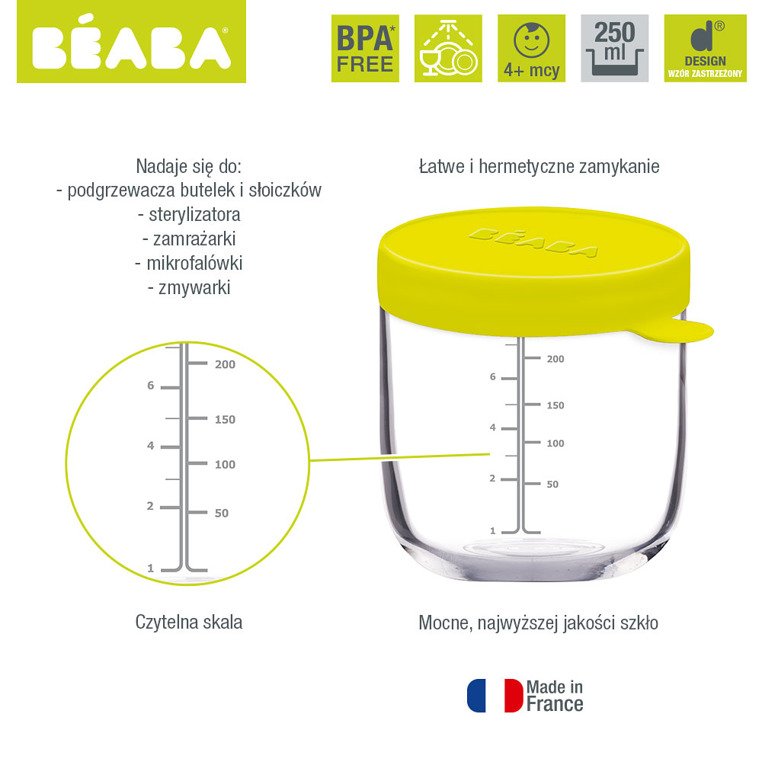 Słoiczek do przechowywania jedzenia francuskiej marki BEABA, wykonany z najwyższej jakości szkła. Bardzo odporny – nie plami się i nie odkształca. Można w nim nie tylko wygodnie przechowywać, ale również odmierzać taką ilość żywności, jaka jest potrzebna dziecku – ma widoczną miarkę w ml i oz – uncjach. Pojemnik nadaje się również do zamrażania oraz podgrzewania posiłków, także w mikrofali. Hermetyczna, miękka pokrywka dobrze przylega do słoiczka, co pozwala zachować smak i aromat jedzenia, a dzięki specjalnemu uchwytowi łatwo ją zdjąć.