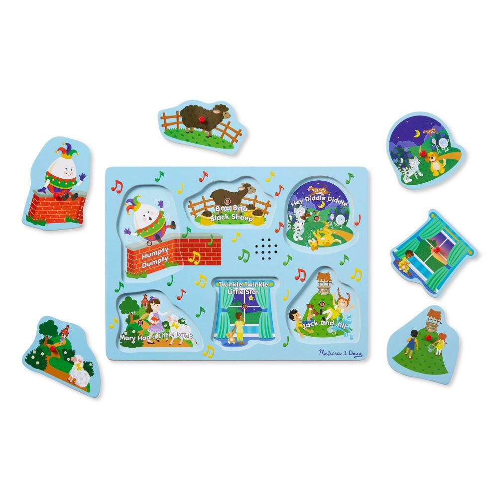 Układanka i puzzle z efektami dźwiękowymi w jednym. Każda melodia została odpowiednio dopasowana do obrazka. I tak po podniesieniu puzzla z uroczym, uśmiechniętym jajeczkiem rozbrzmiewa: „Humpty Dumpty” a z czarną wesołą owieczką: „ Baa, baa black sheep”. Dzięki temu, że na podstawie znajduje się 6 puzzli z różnymi scenkami, dziecko ma do odkrycia aż 6 różnych, ciekawych dźwięków!