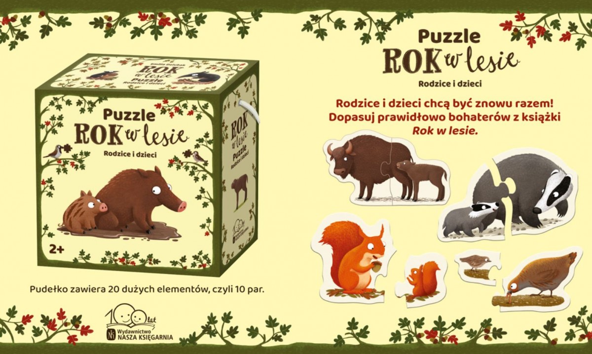 Rok w lesie. Puzzle. Rodzice i dzieci zachęcają do poznawania nowych zwierząt, a także rozwijają wyobraźnię i ćwiczą dokładność i cierpliwość. Zjawiskowe grafiki Emilii Dziubak sprawiają, że to doskonały pomysł na prezent.