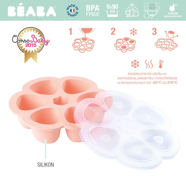 Silikonowy pojemnik do mrożenia jedzenia francuskiej marki BEABA. Pozwala na przechowanie 6 porcji jedzenia jednocześnie, po maksymalnie 90 ml każda, a następnie na rozmrażanie takiej ilości żywności, jaka jest potrzebna dziecku, w zależności od jego wieku czy apetytu. W każdym z pojemników można też zamrozić inne danie. Idealny do używania razem z Babycook®, sprawdzi się także niezależnie.