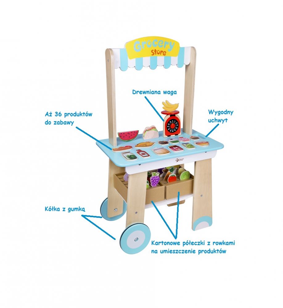 Całość sprawia, że od razu po złożeniu zabawki można przystąpić do zabawy. produkty można układać w skrzynkach lub bezpośrednio na blacie. Na dole półeczka z tkaniny do ułożenia skrzynek lub produktów.