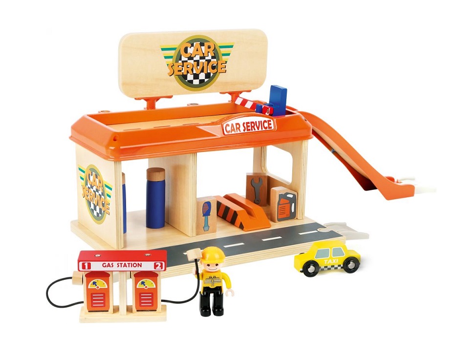 Stacja serwisowa będzie widoczna z daleka dzięki umieszczonej na górze tablicy z szyldem oraz ciekawej kolorystyce. Na dole znajdziecie myjnię oraz warsztat samochodowy. Świetnym dodatkiem jest stacja benzynowa na dwa dystrybutory. Na górze parking dla klientów i pracowników warsztatu z możliwością wjazdu i zjazdu z boku po zjeżdżalni.
