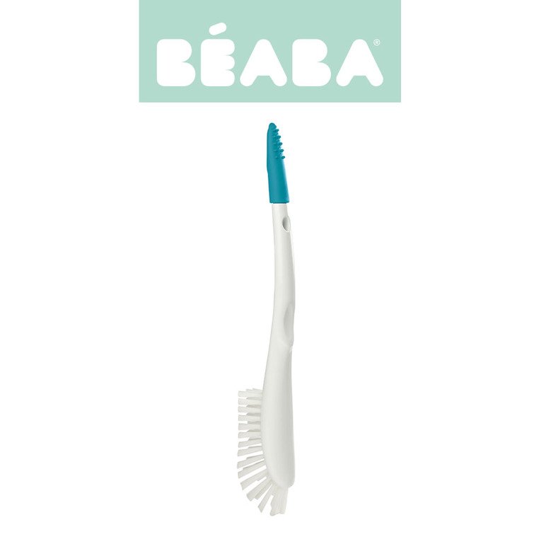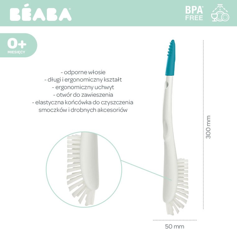 Biała szczotka do butelek i smoczków francuskiej marki BEABA. Jej wydłużony, ergonomiczny kształt z lekko zakrzywioną główką ułatwia dokładne czyszczenie butelek i innych pojemników. Nylonowe włosie nie ulega zniekształceniom, a turkusowa wyprofilowana, wąska końcówka z wypustkami nadaje się idealnie do czyszczenia smoczków, mniejszych akcesoriów i wszelkich zakamarków. Wygodę użytkowania gwarantuje rękojeść z zagłębieniem na palec oraz otworem do zawieszania szczotki w kuchni. Szczotka jest łatwa do utrzymania w czystości, należy ją myć ręcznie.