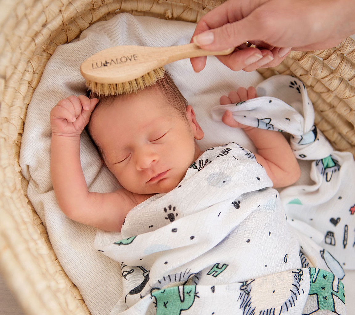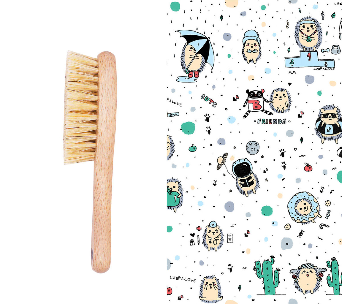 Małych rozmiarów szczotka z naturalnym włosiem o idealnym stopniu twardości dostosowanym do skóry dzieci. Doskonale wyczesuje i masuje skórę głowy pomagając przy ciemieniusze. Pomocna przy rozczesywaniu kołtunów. W komplecie ze szczotką delikatna, muślinowa myjka, która sprawdzi się w codziennej pielęgnacji Maluszka.