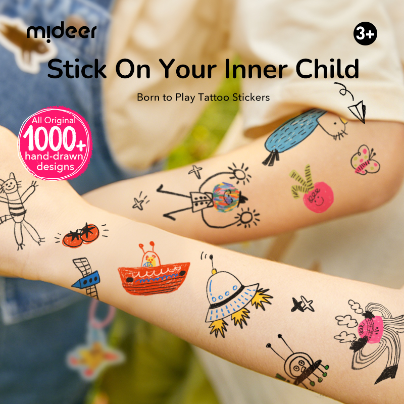 Niebieski zestaw tatuaży Mideer Cosmic Adventure w wersji maxi to ponad tysiąc tatuaży w większym wymiarze. Pozwala tworzyć różne światy: od kosmicznych motywów, przez zwierzęce przygody, dziecięce bazgrołki, pieski, foki i okejki.