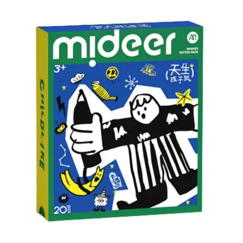 Niebieski zestaw tatuaży Mideer Cosmic Adventure w wersji mini to ponad tysiąc miniaturowych tatuaży. Pozwala tworzyć różne światy: od kosmicznych motywów, przez zwierzęce przygody, dziecięce bazgrołki, pieski, foki i okejki.