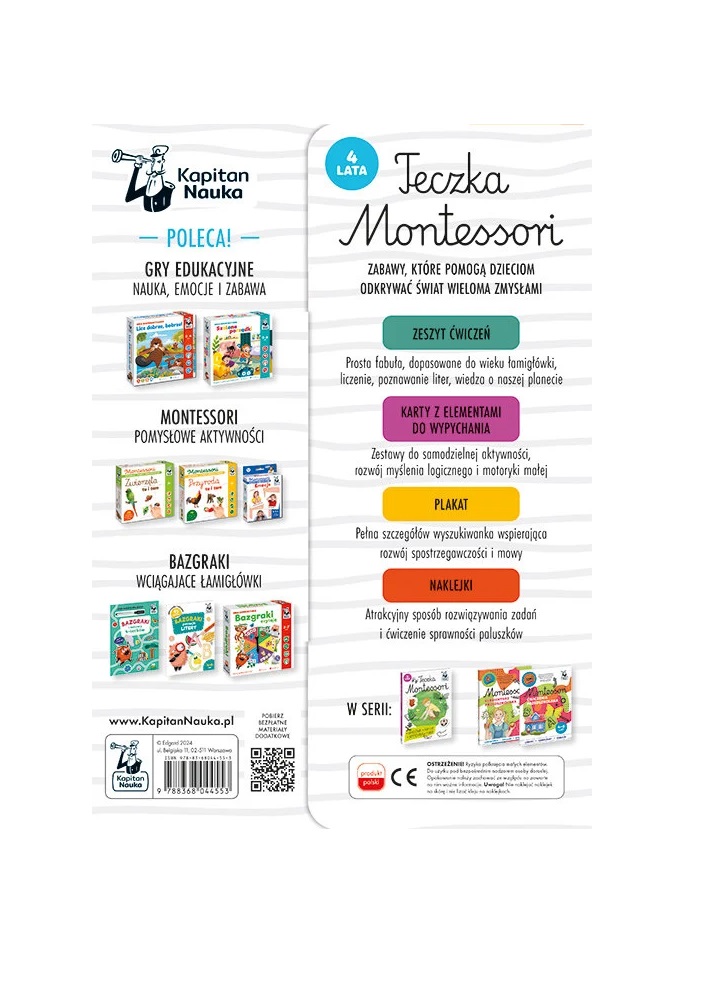 Teczka Montessori to zbiór rozwijających aktywności, który pomoże przedszkolakom odkrywać otaczający je świat. Zabawy i zadania bazują na wrażeniach sensorycznych, dzięki czemu dziecko może zdobywać wiedzę w najbardziej naturalny dla niego sposób – poprzez doświadczenie i działanie.