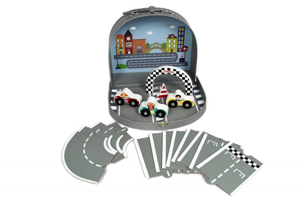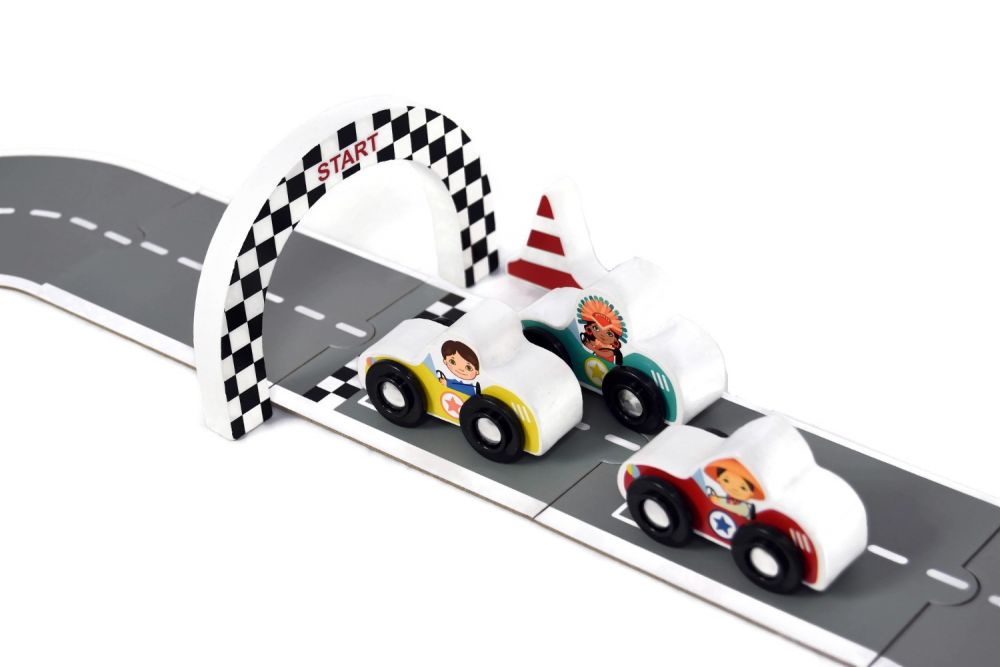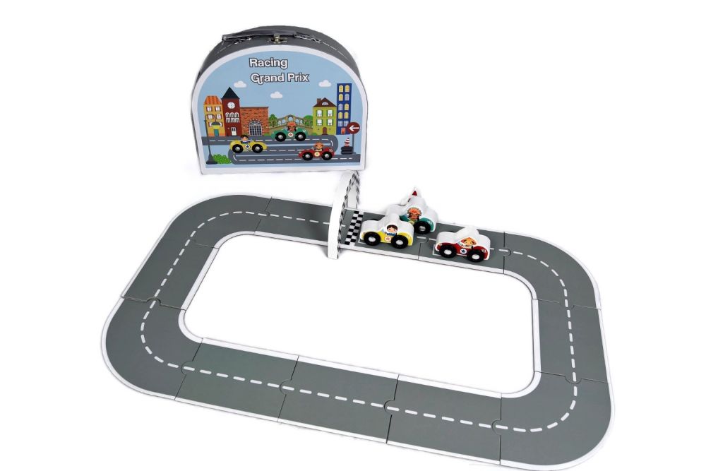 W tej prostej zabawce pomyśleliśmy o wielu szczegółach. Każde autko ma innego kierowcę, aby wyścig był atrakcyjny. Puzzle startowe mają oznaczone miejsca na samochody, jak na prawdziwym torze wyścigowym. Nad startem możecie ustawić specjalną bramkę. A walizeczka, w której możecie przechowywać swój zestaw dopełnia całości. Dzięki walizce całość zyskuje również mobilności, bo łatwo możecie ją wszędzie ze sobą zabrać.