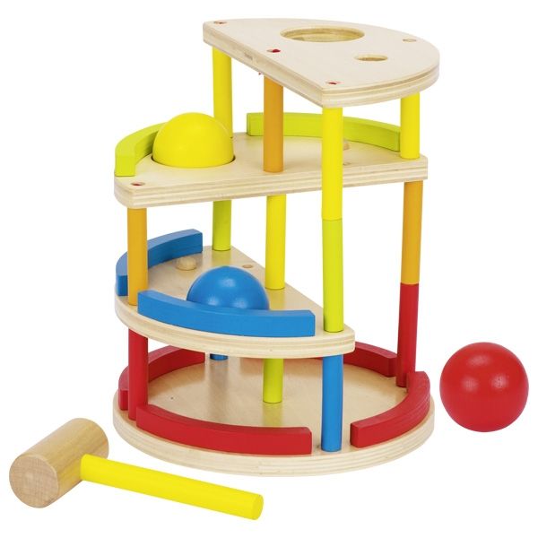 Drewniany, duży tor dla kolorowych kulek to nie lada atrakcja. Głównie ze względu na nieograniczoną możliwość uderzania młotkiem!