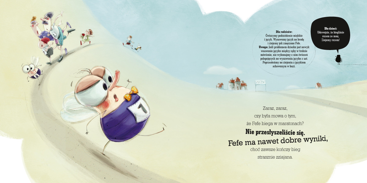 Nie każdy rodzic posiada odpowiednią wiedzę w tej kwestii. Dlatego warto sięgnąć po pomoc w postaci książki „Z muchą na luzie ćwiczymy buzie”. Znajdziemy tu ćwiczenia z zakresu uzyskania odpowiedniej ruchomości narządów artykulacyjnych: warg, języka, podniebienia miękkiego i żuchwy. Trenować jest jednak najlepiej poprzez zabawę, a nikt nie zachęci do tego lepiej, niż główna bohaterka książki, mucha Fefe. Jak każda muszka ma łapki, skrzydełka, trąbkę i wielkie oczy, pod każdym innym względem jest ona jednak wyjątkowa.