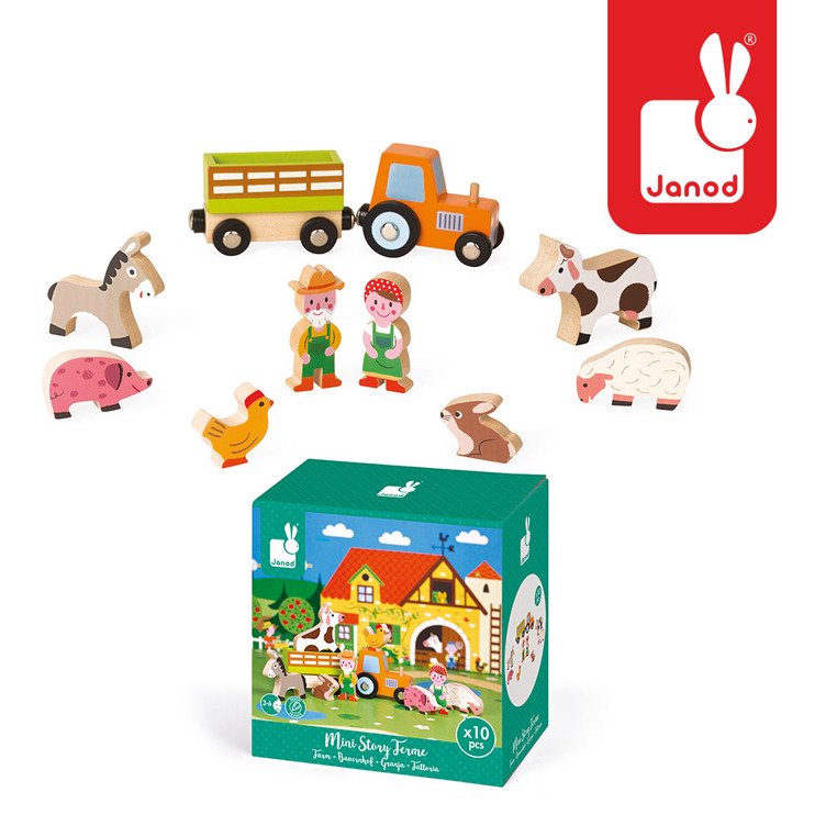 Zestaw drewniany Farma z kolekcji STORY francuskiej marki JANOD to idealny prezent dla dziecka, które uwielbia tworzyć i opowiadać własne historie. Składa się z 10 pięknie zaprojektowanych i starannie wykonanych elementów. Są to: para farmerów, krowa, osiołek, świnka, owieczka, królik i kura, a także traktor z przyczepą, łączącą się z nim za pomocą magnesu. Dzięki magnesom pojazd ten można również połączyć np. z wagonikami drewnianych kolejek marki. W przyczepie można umieścić wybrane zwierzątko. Zestaw pozwala na tworzenie wielu scenariuszy zabaw z farmerami w roli głównej.