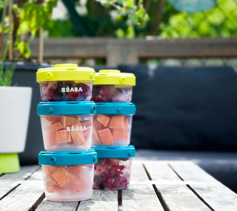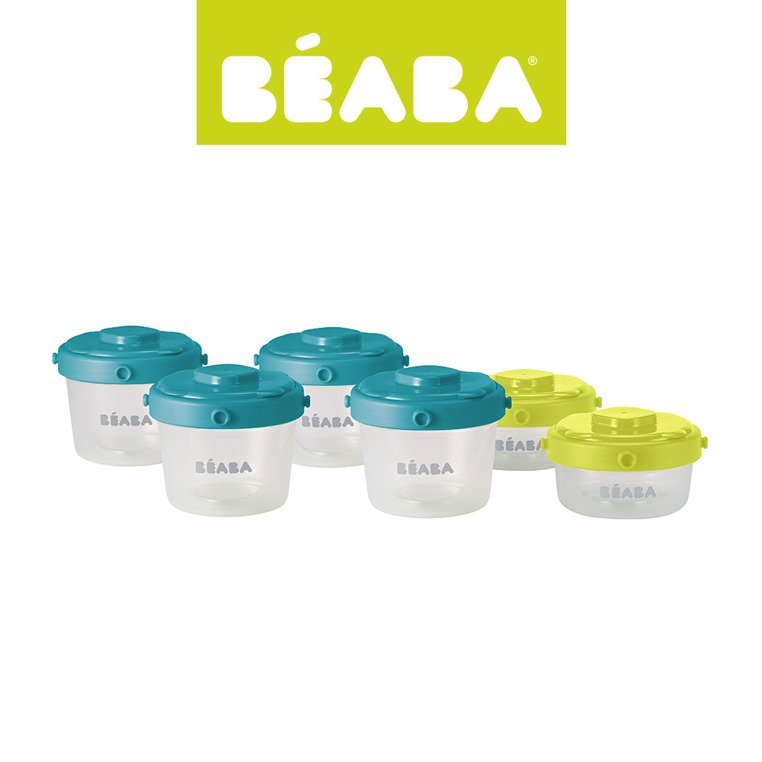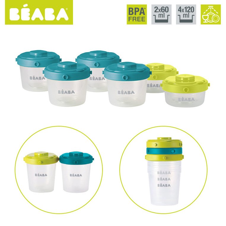 Pojemniki do przechowywania jedzenia francuskiej marki BEABA, wykonane z materiału wolnego od BPA. W skład zestawu wchodzą dwa mniejsze słoiczki o pojemności 60 ml z neonowymi zielonymi pokrywkami i 4 większe słoiki – po 120 ml pojemności, z turkusowo-niebieskimi pokrywkami. Można w nich nie tylko wygodnie przechować taką ilość żywności, jaka jest potrzebna dziecku. Pojemniki nadają się również do zamrażania oraz podgrzewania w Babycook® i Babycook® Plus.