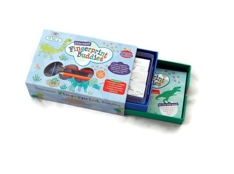 Wystarczy zamoczyć stempelek lub paluszek w tuszu i odbijać na kartce, aby stworzyć nowe dzieło sztuki. W tym zestawie znajduje się wszystko co potrzeba do wykonania prehistorycznego świata i dinozaurów